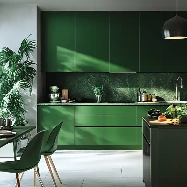 Hunter green cabinets provide a bold, grounded look that pairs well with modern or industrial kitchen styles. Contrast with white walls and stainless steel for a clean finish.
