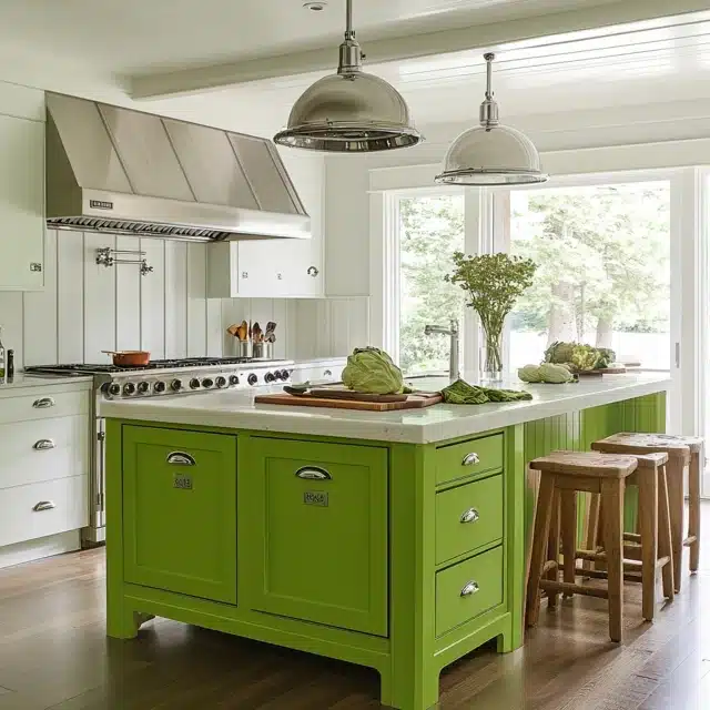 If you’re not ready to commit to full green cabinetry, try painting your kitchen island instead. It’s a stylish way to incorporate color without overwhelming the space.